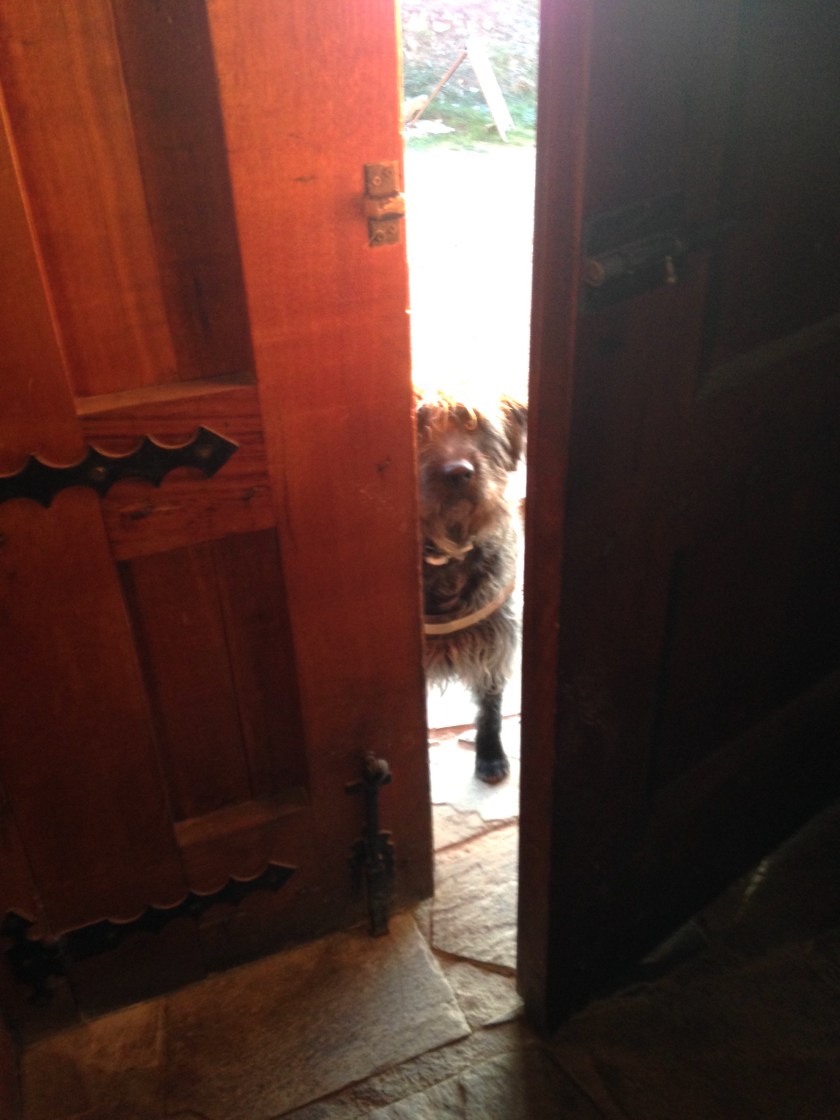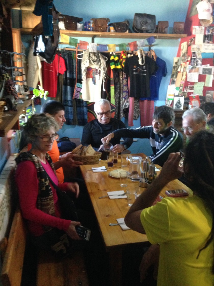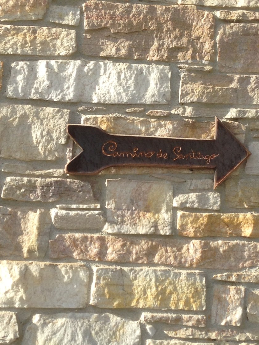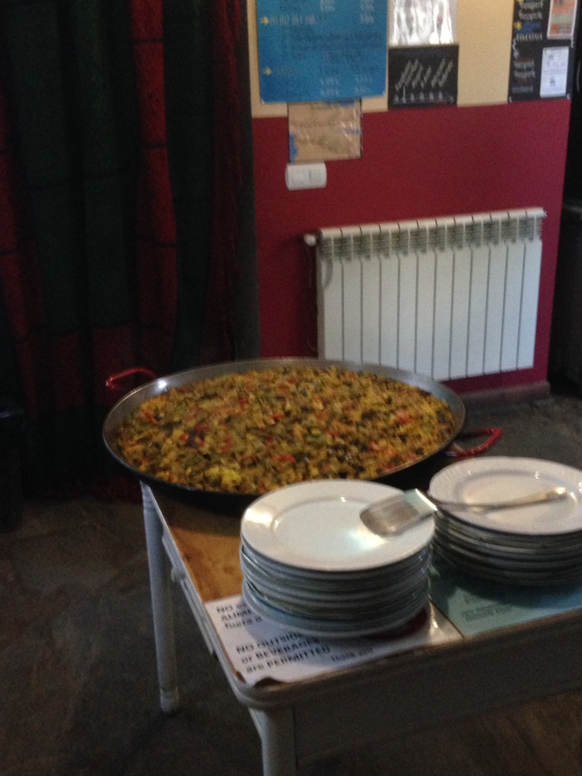 I know I reported on the very basic nature of our albergue last night. Basic can often bring wonder though! As last year (yep, 2 years in a row at the same place), everyone at the albergue joined together for a communal supper – and what a meal it was – homemade hummus on crusty bread, a fantastic salad and an amazing vegetarian paella. At our table we had 2 Italians, 1 German, the pair of us and 2 Spaniards – and the common language of the Camino worked perfectly in translation. The one Spanish fellow, Julio, is travelling with his dog, Cippi (I think I posted a picture of Rosemary on the trail with Cippi coming up behind yesterday). Cippi is super well behaved but nonetheless, all dogs (and their owners) are relegated to the (I think unheated) trailers out back – and it was cold last night!!!
