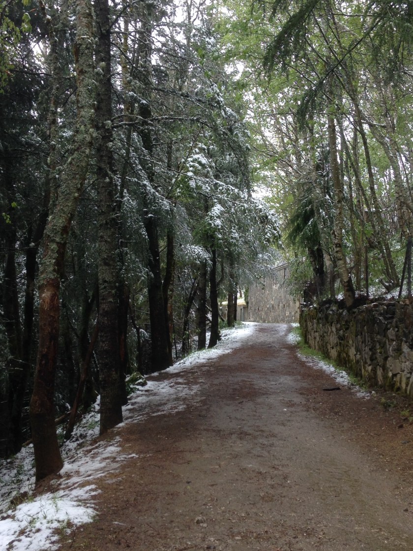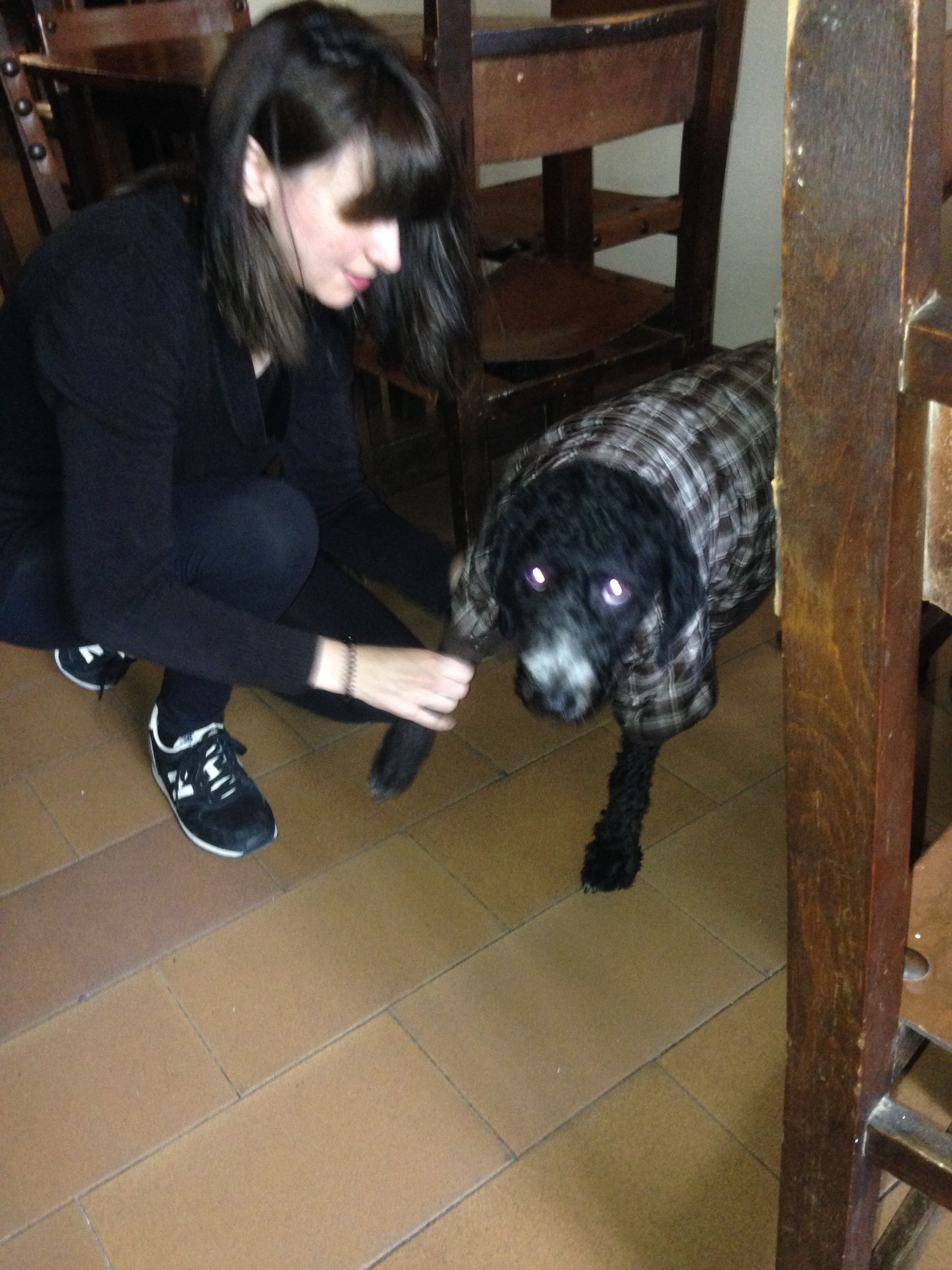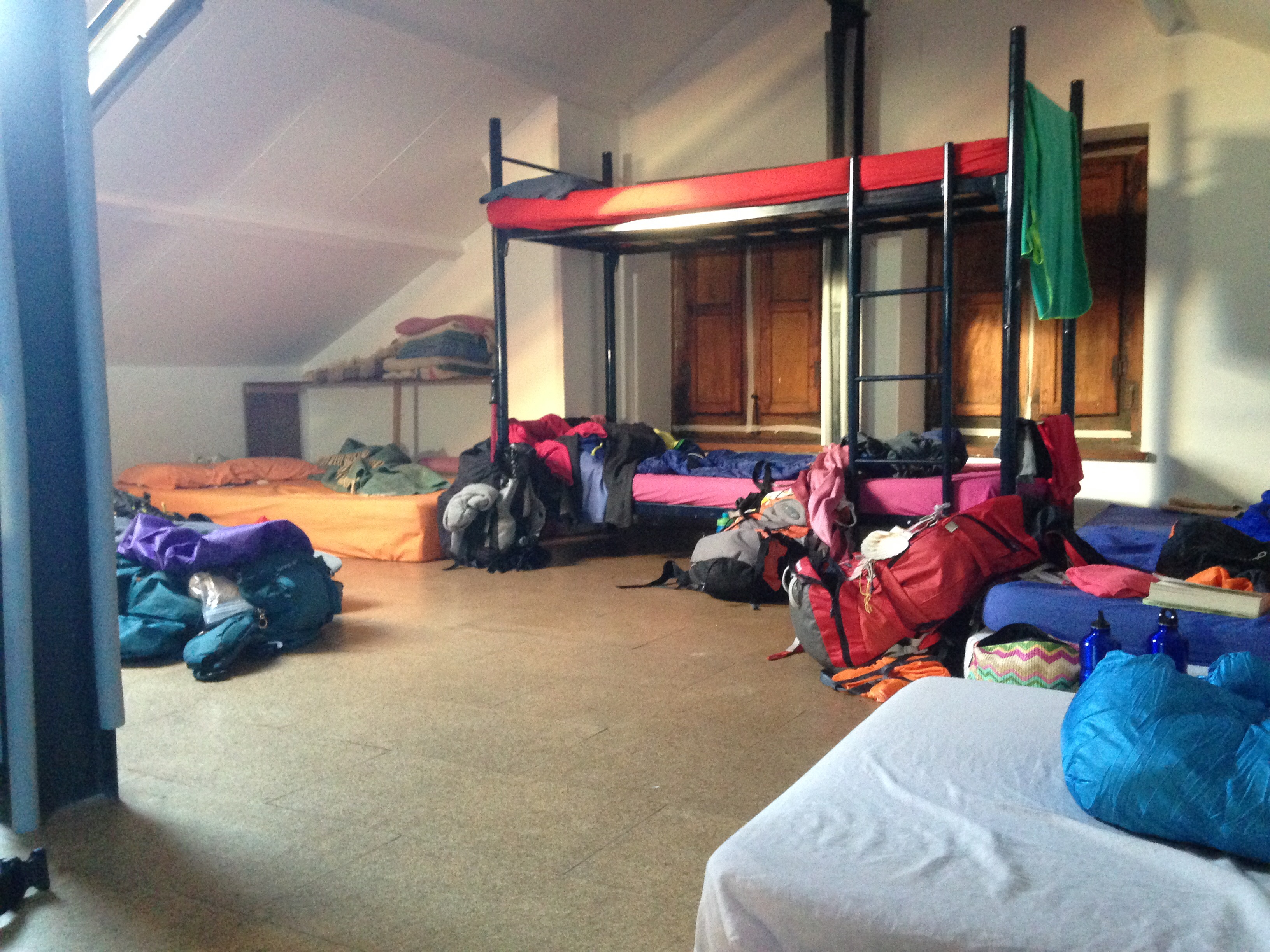 I know I reported on the very basic nature of our albergue last night. Basic can often bring wonder though! As last year (yep, 2 years in a row at the same place), everyone at the albergue joined together for a communal supper – and what a meal it was – homemade hummus on crusty bread, a fantastic salad and an amazing vegetarian paella. At our table we had 2 Italians, 1 German, the pair of us and 2 Spaniards – and the common language of the Camino worked perfectly in translation. The one Spanish fellow, Julio, is travelling with his dog, Cippi (I think I posted a picture of Rosemary on the trail with Cippi coming up behind yesterday). Cippi is super well behaved but nonetheless, all dogs (and their owners) are relegated to the (I think unheated) trailers out back – and it was cold last night!!!